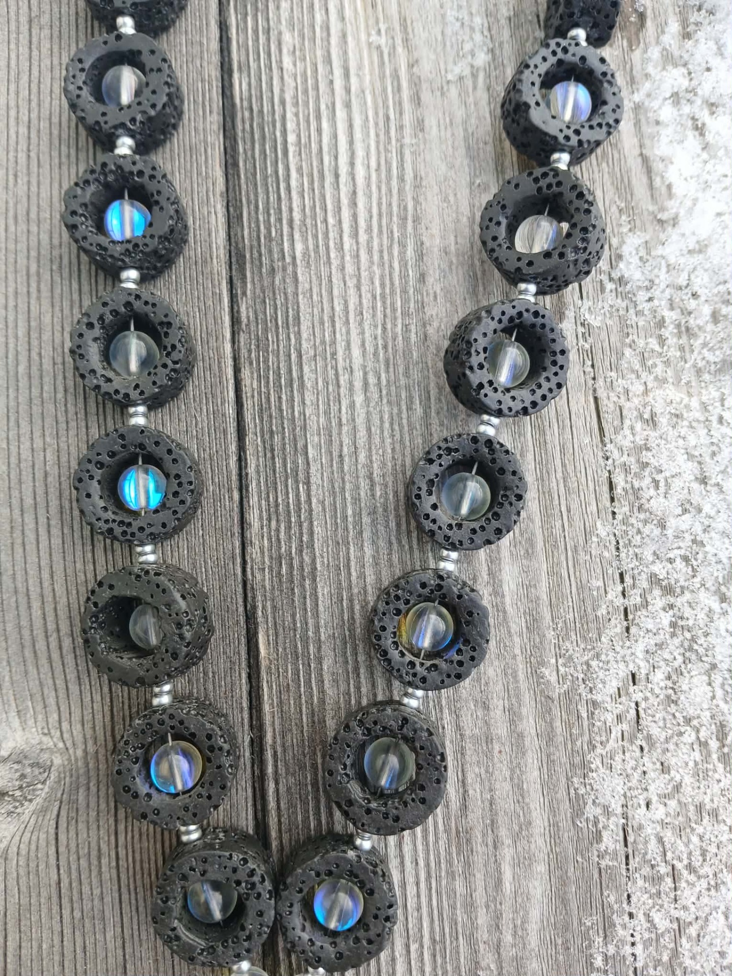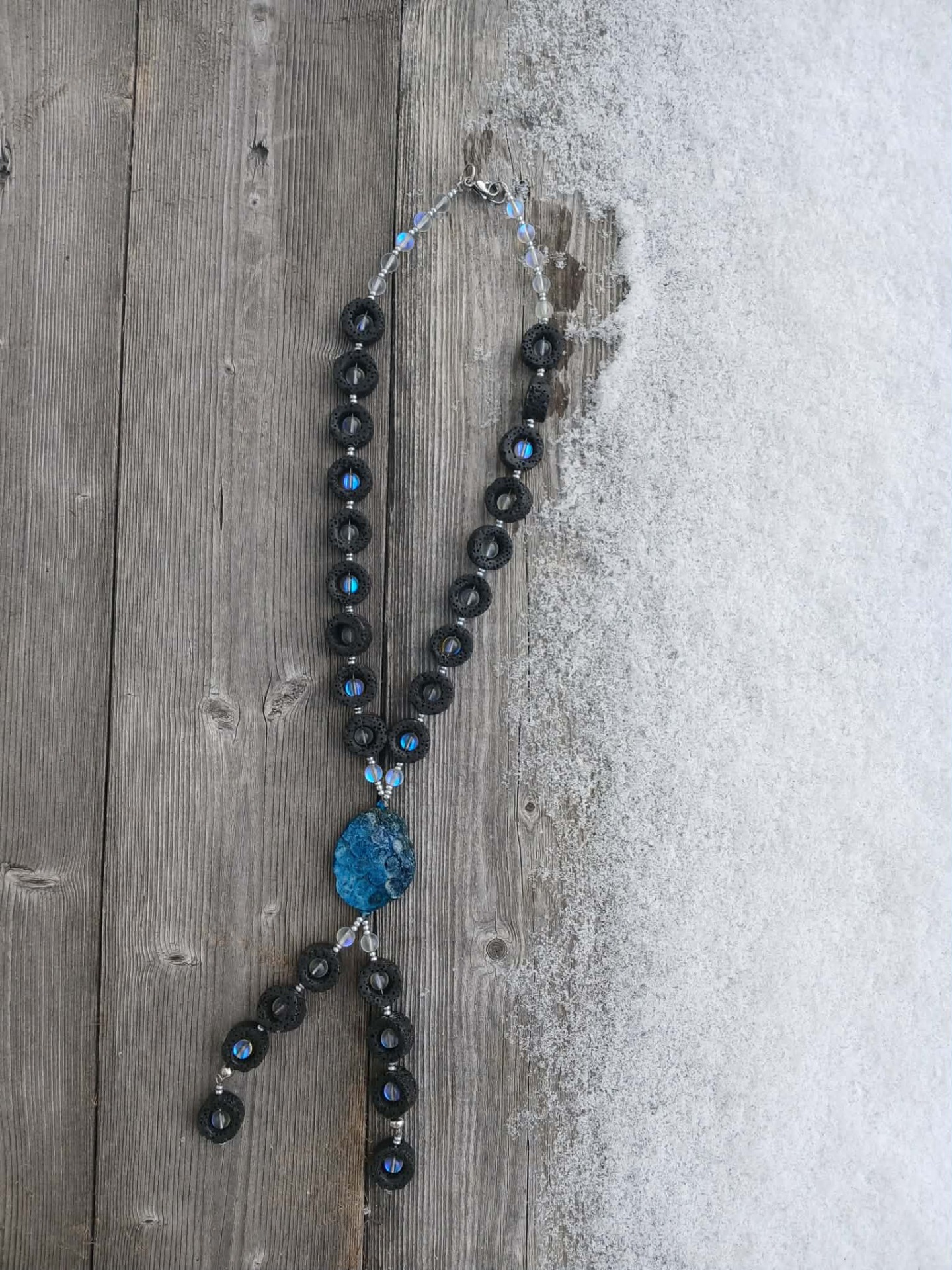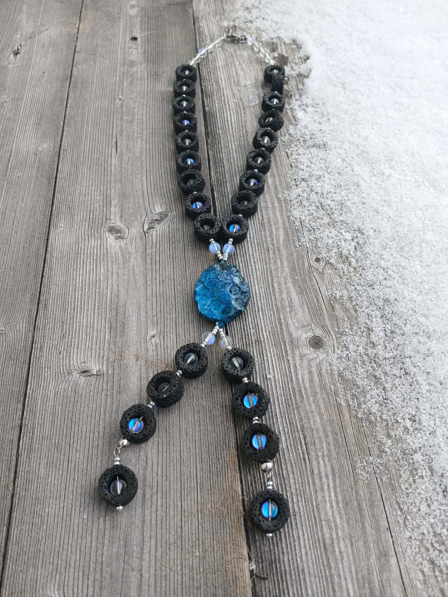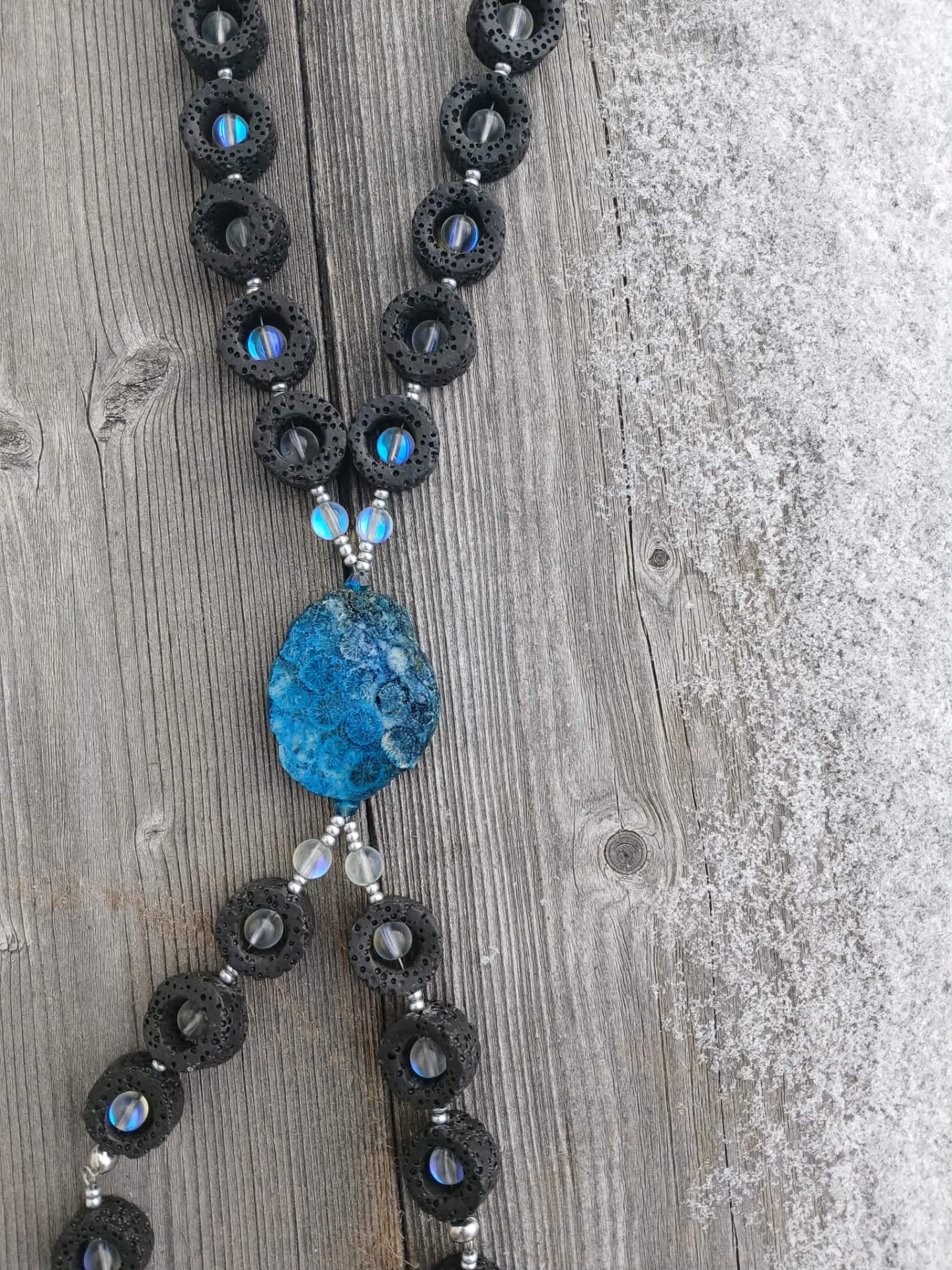 - Halsband "En Droppe ur Havet" består av Lavastenar, Glasstenar och en Coral Jade Fossil sten.