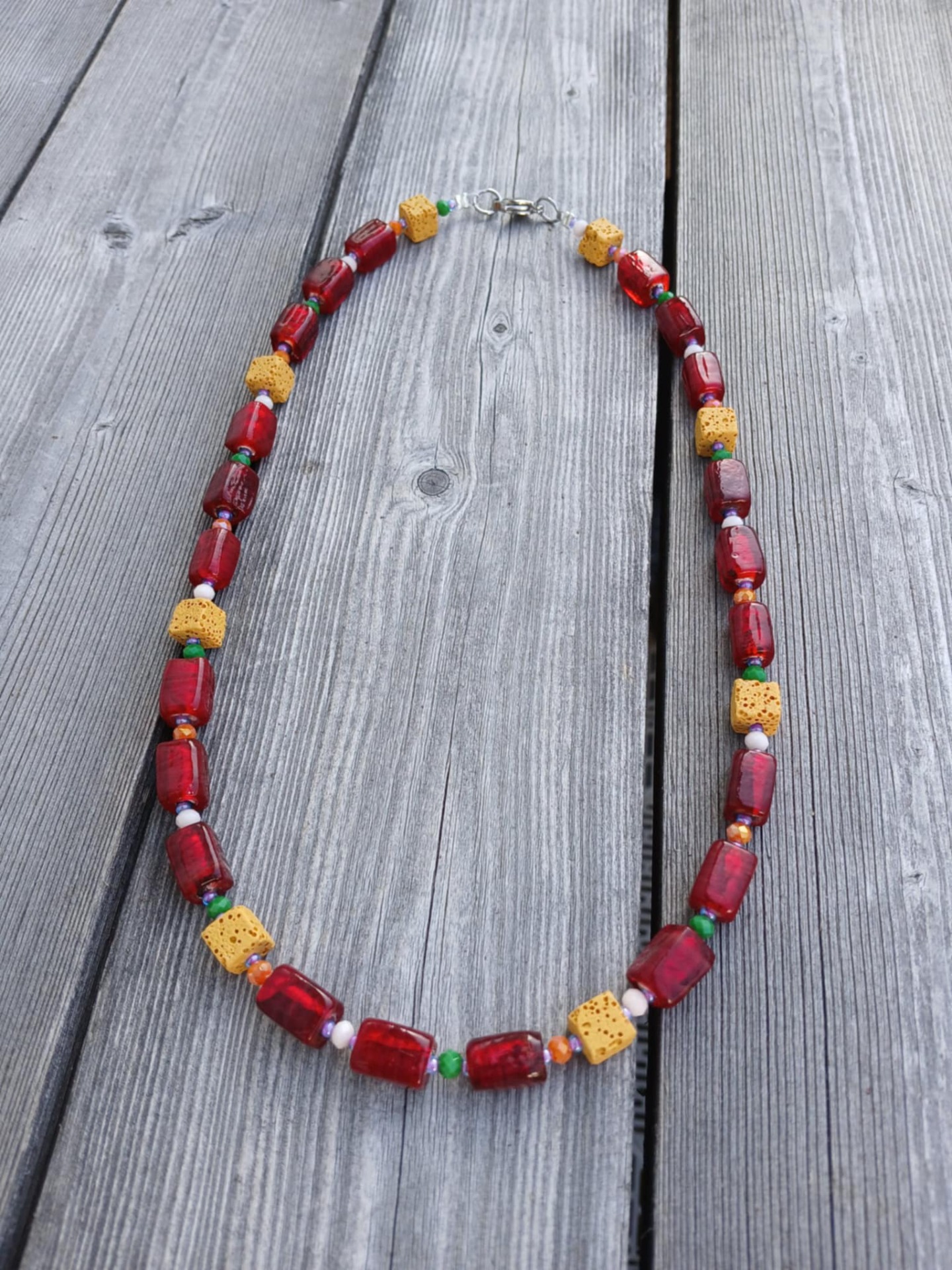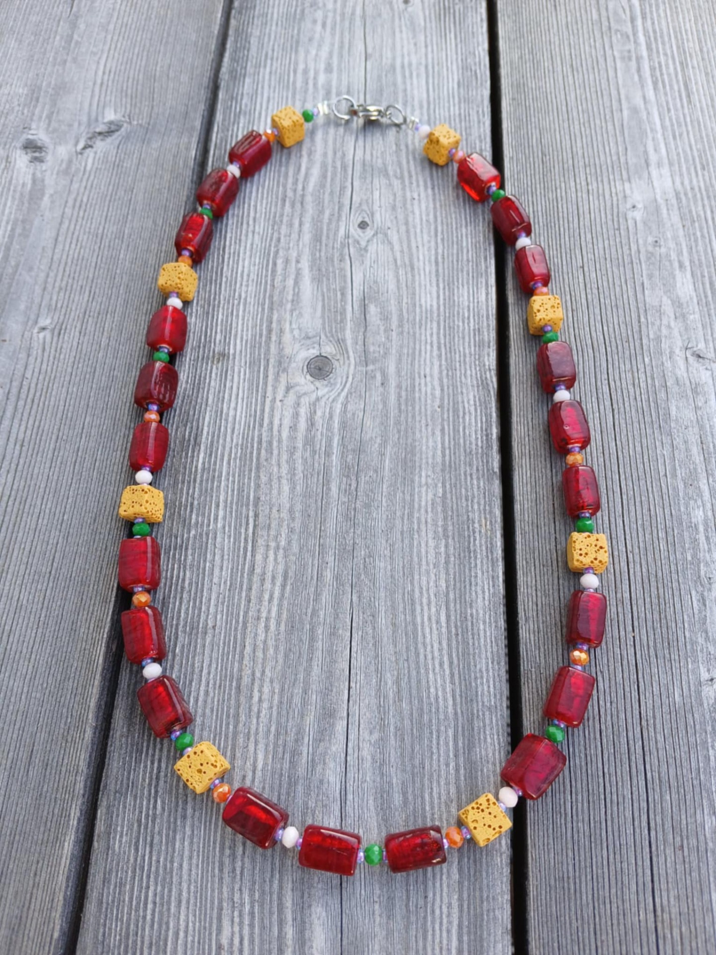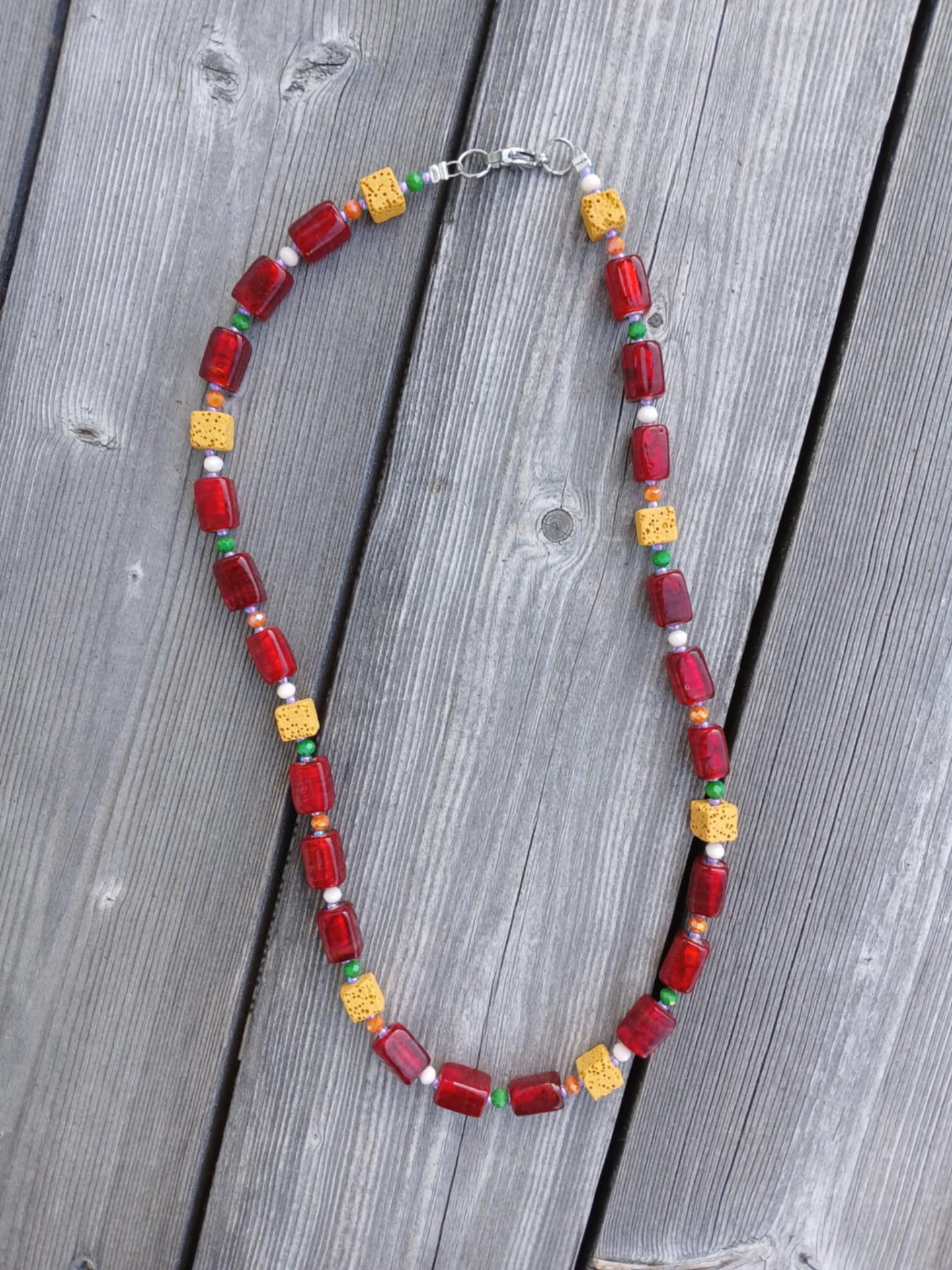 - Halsband "Exotisk Frukt" består av glasstenar i olika färger både stora  och små pärlor, samt lavastenar.