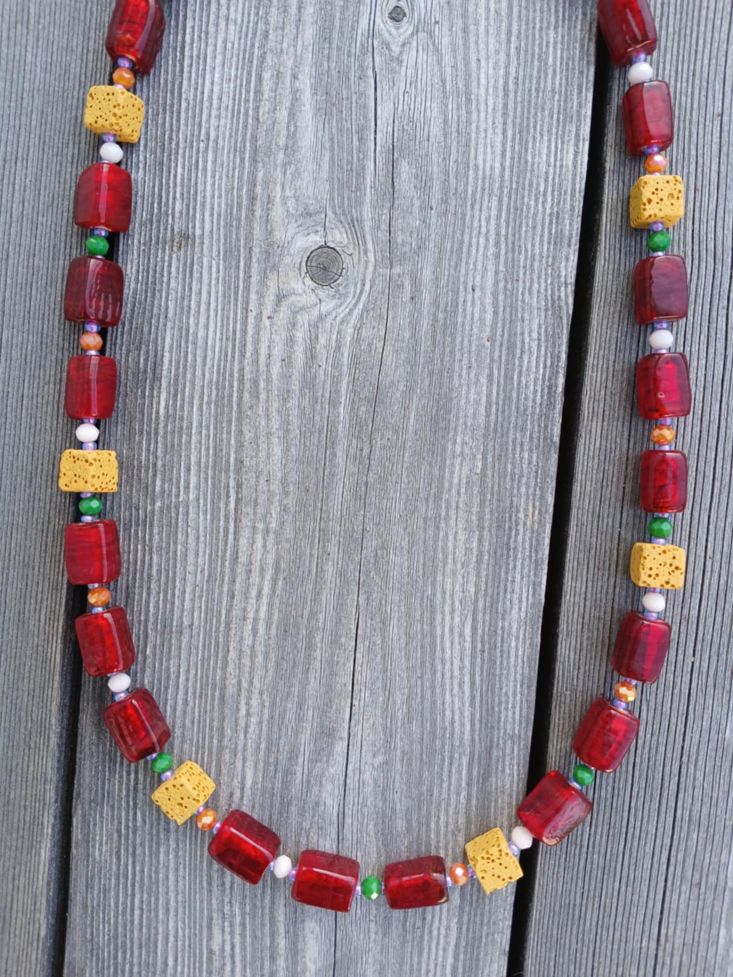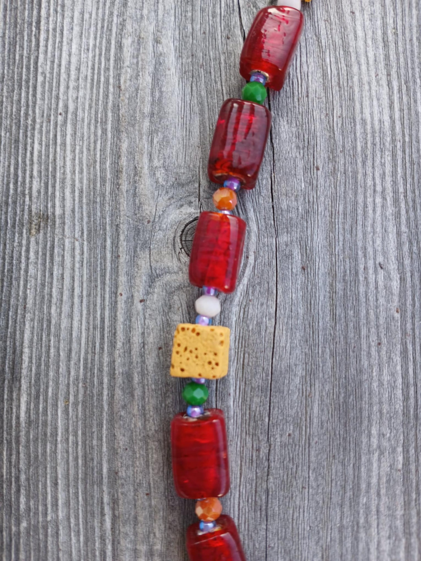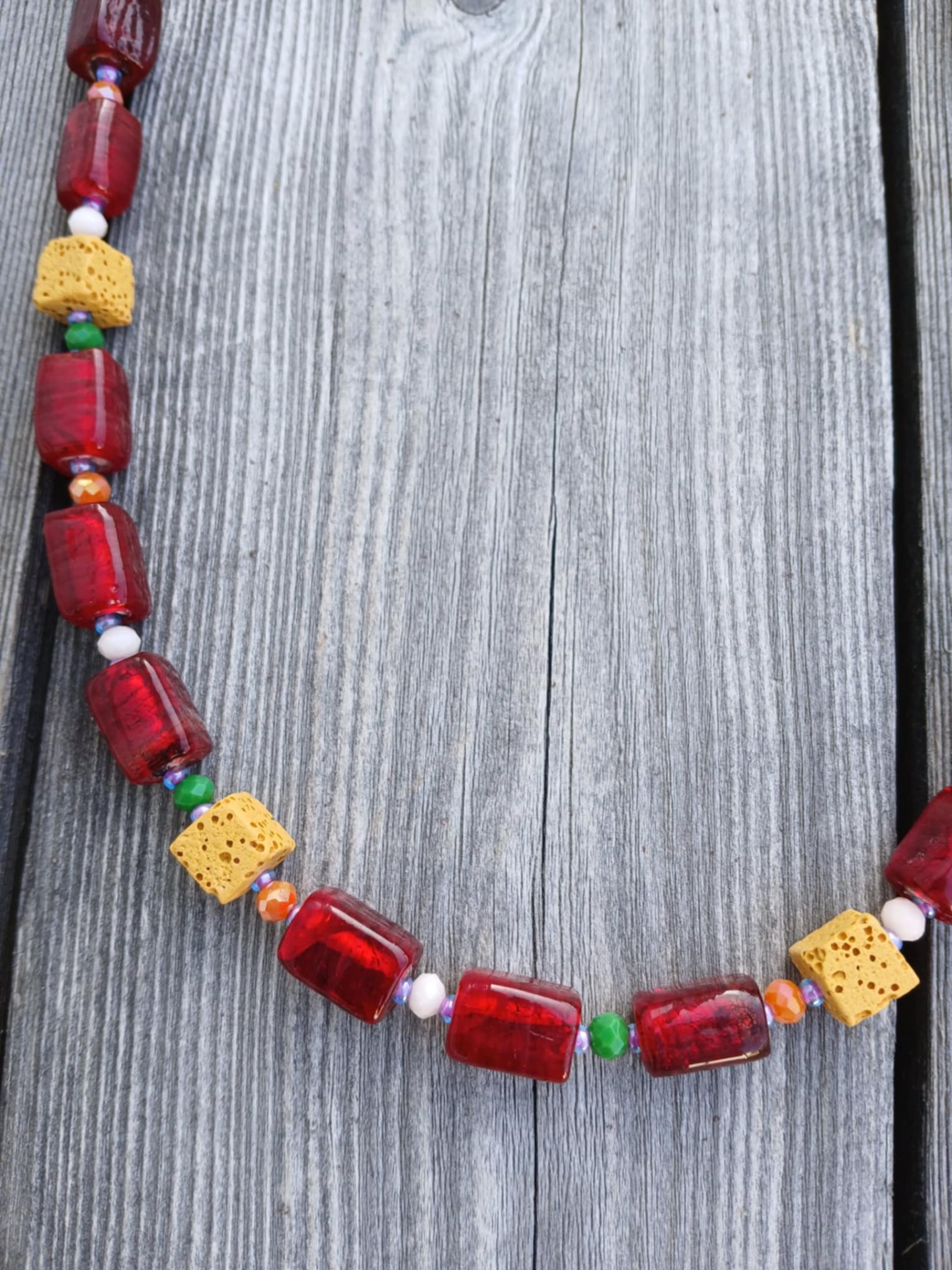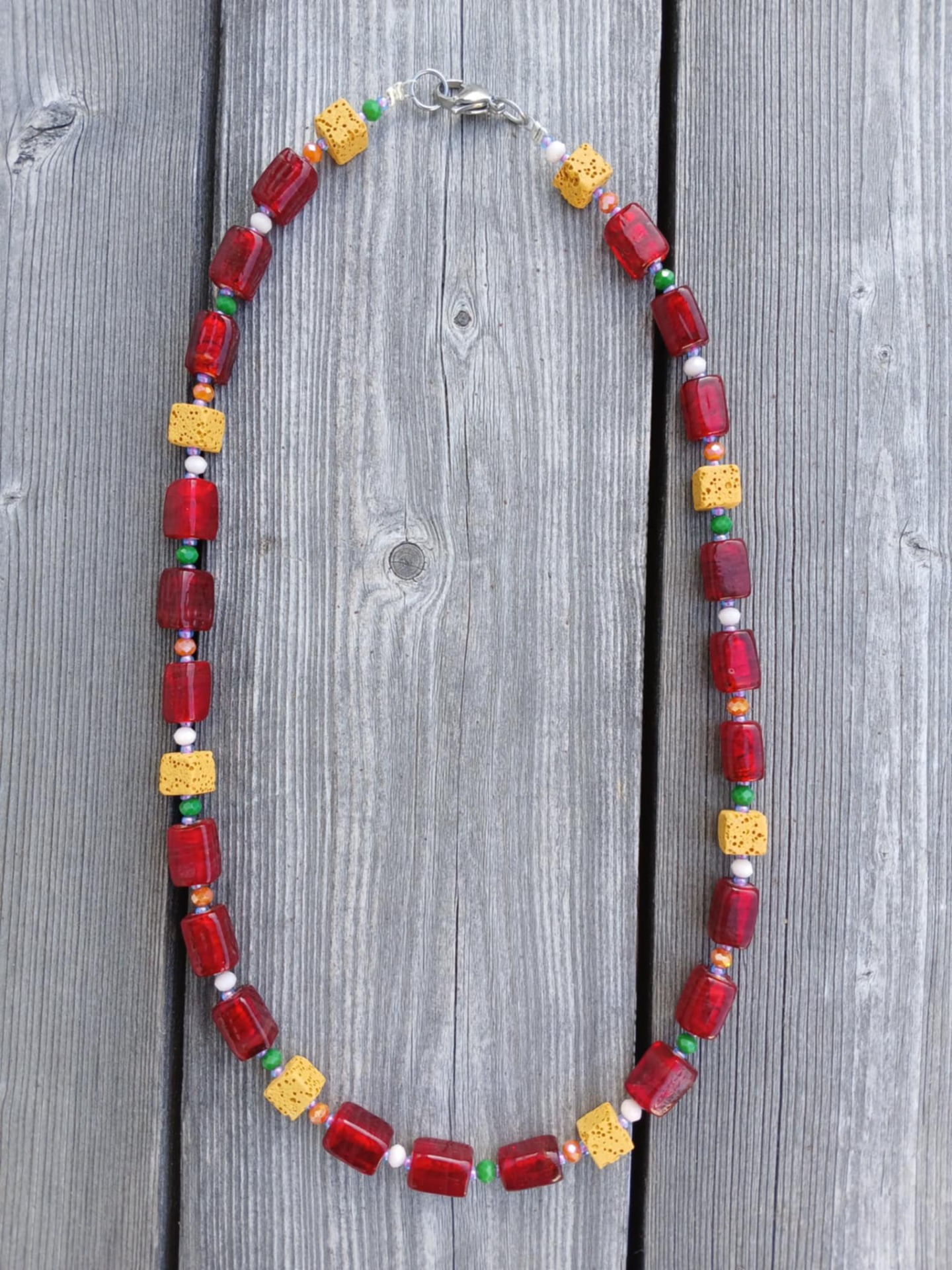 - Halsband "Exotisk Frukt" består av glasstenar i olika färger både stora  och små pärlor, samt lavastenar.