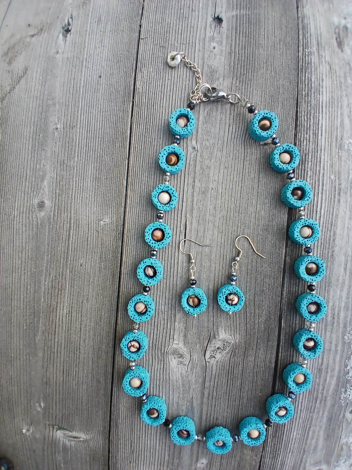 - Halsband "River from the West" består av Lavastenar, Zebra Jaspis stenar och facetterade glaspärlor.