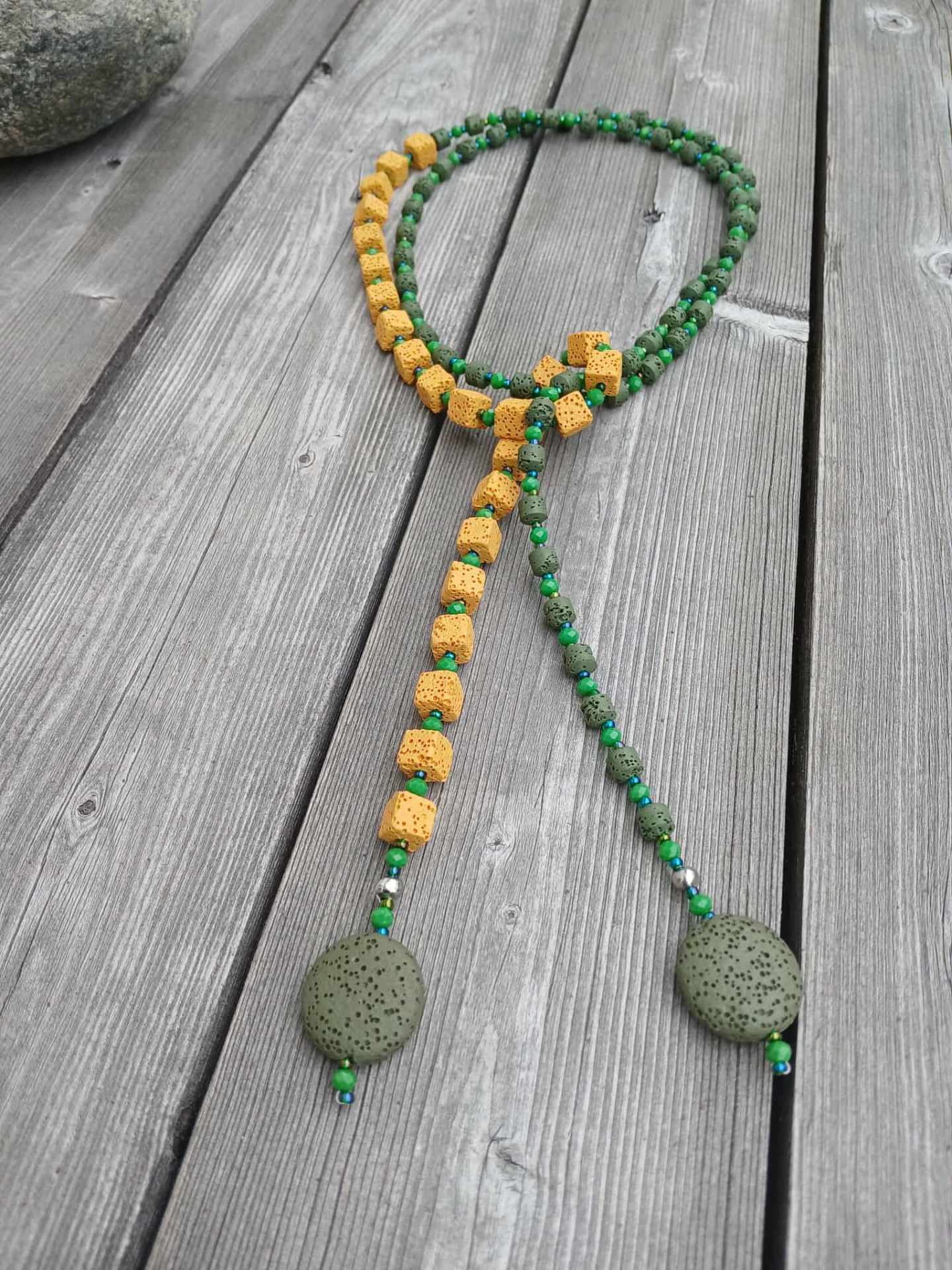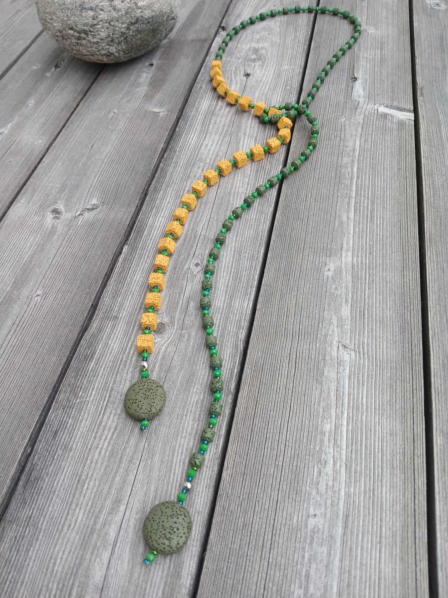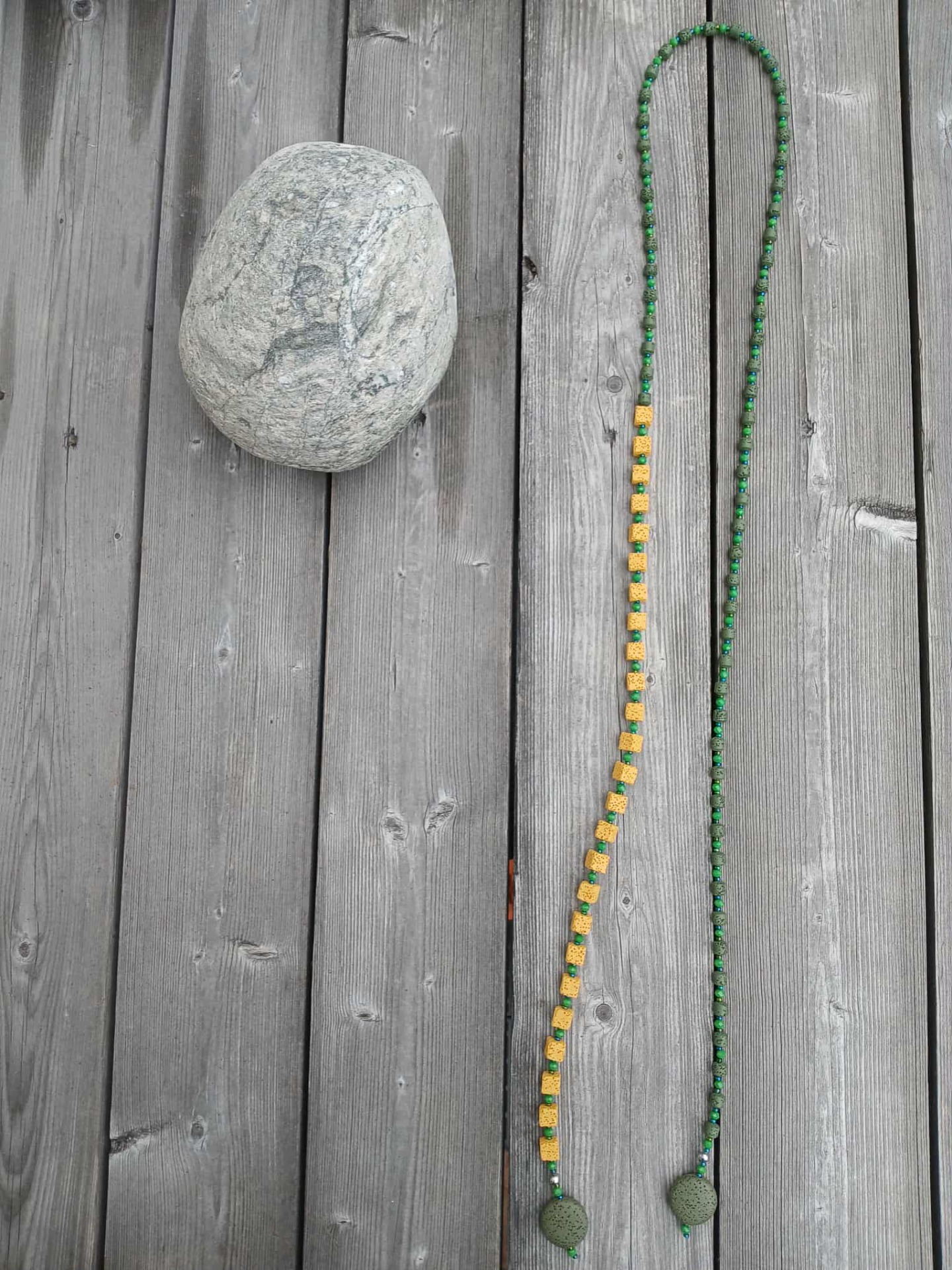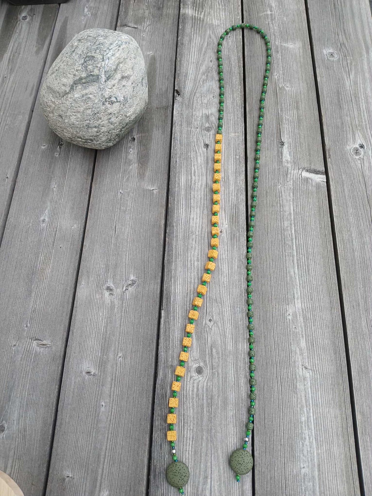 - Halsband "September nr2" består av Lavastenar i olika former, samt små facetterade glasstenar och små, små Seed Beads av glas.