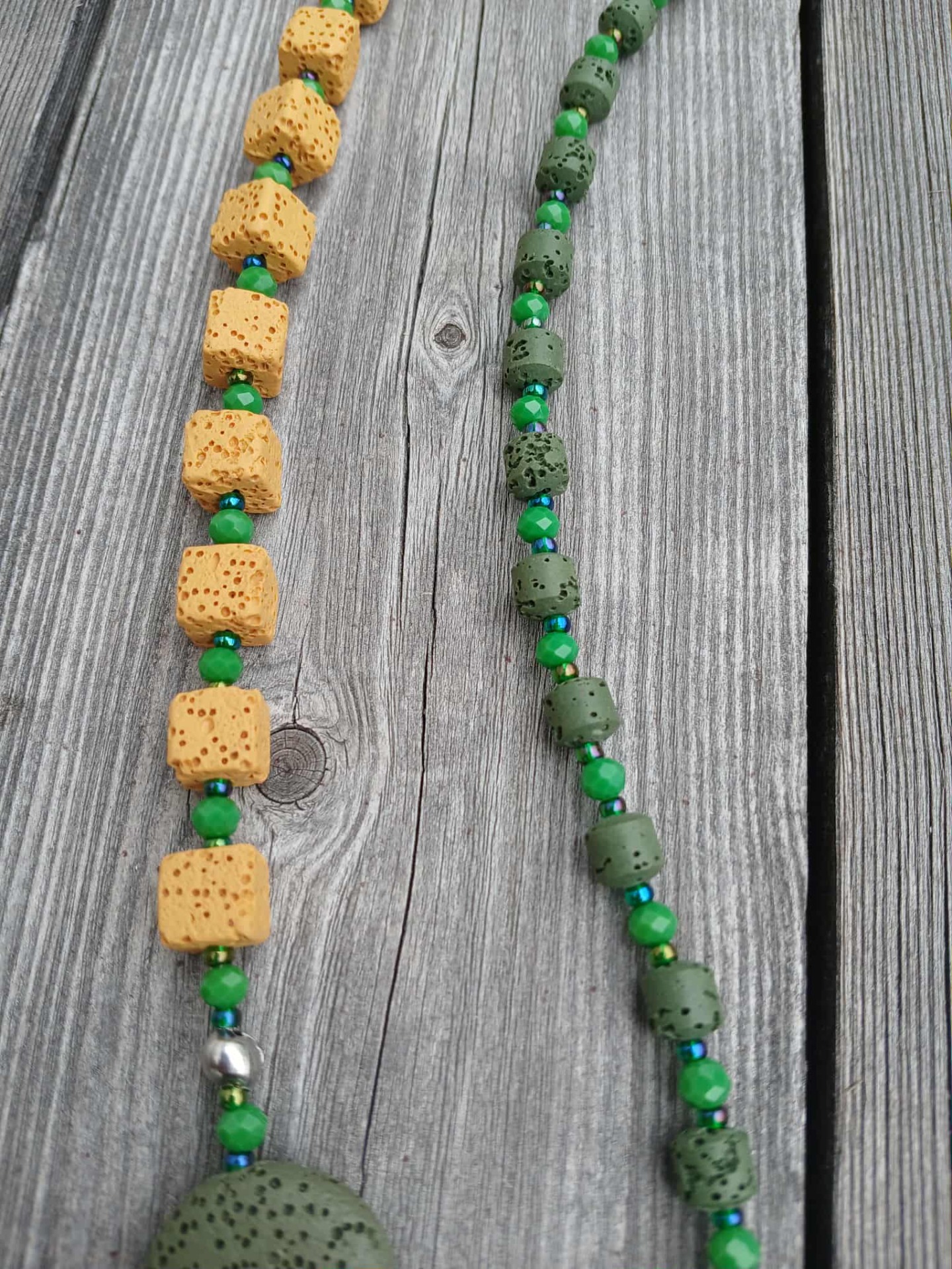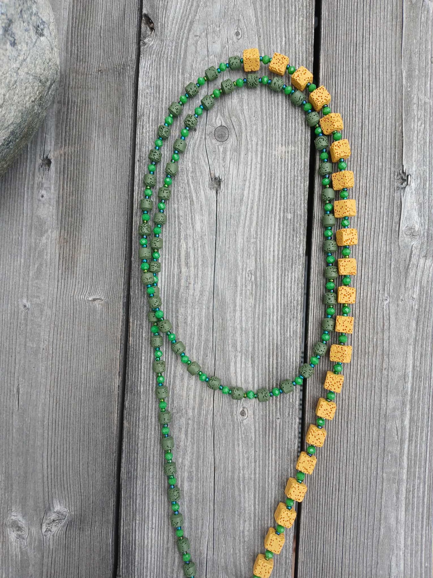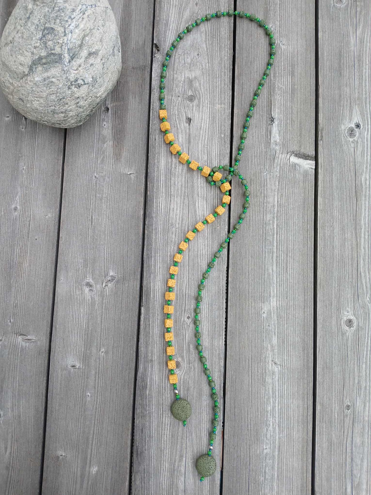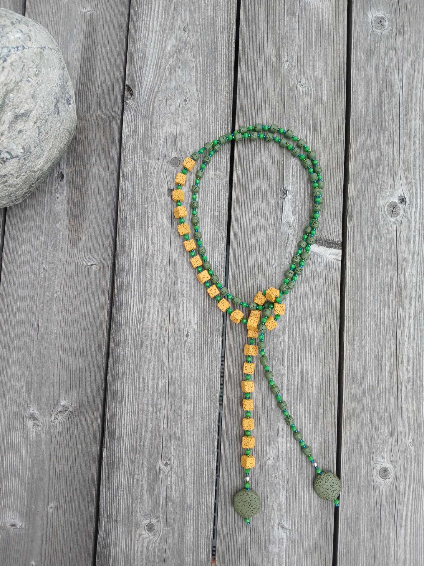 - Halsband "September nr2" består av Lavastenar i olika former, samt små facetterade glasstenar och små, små Seed Beads av glas.