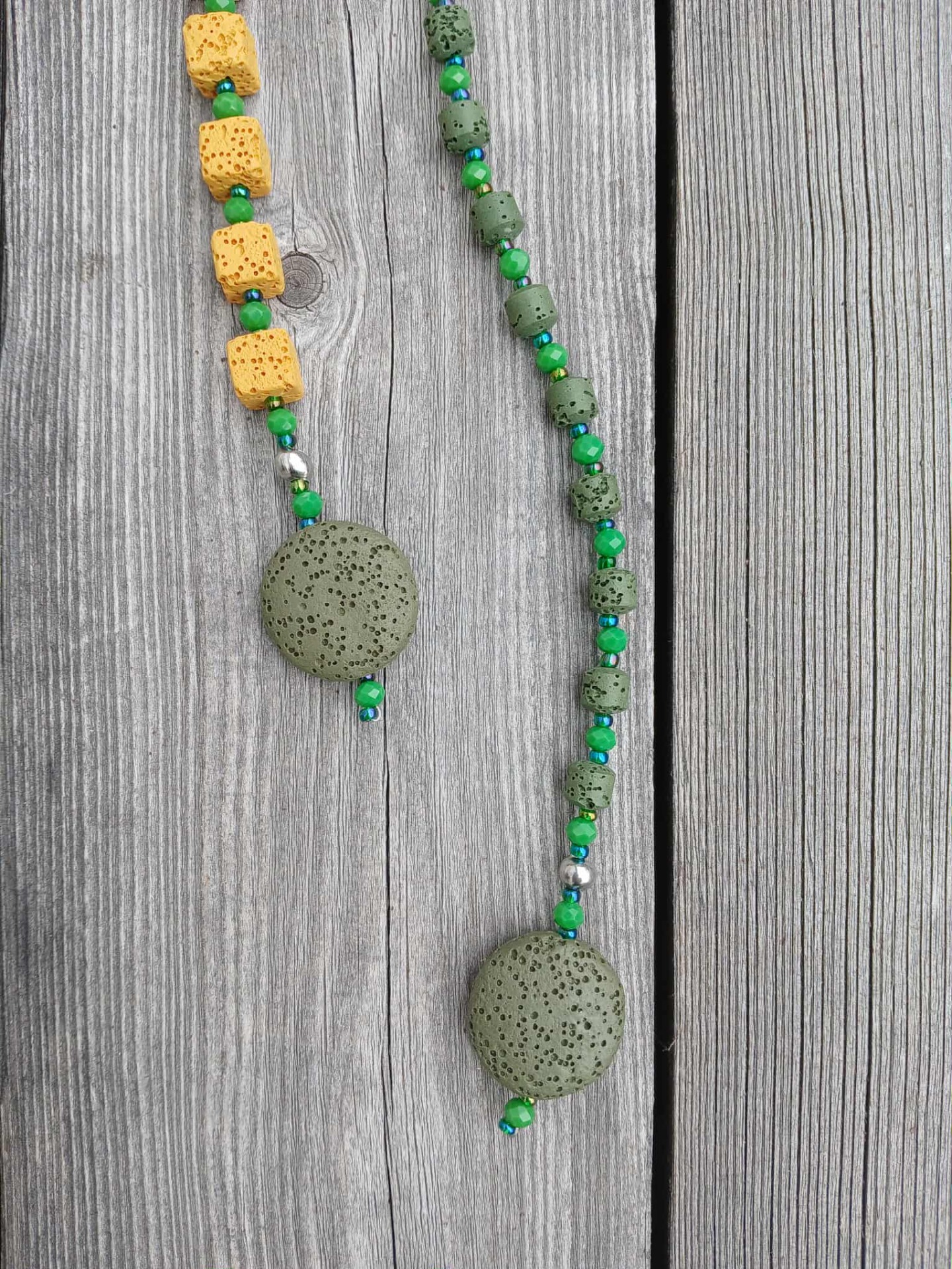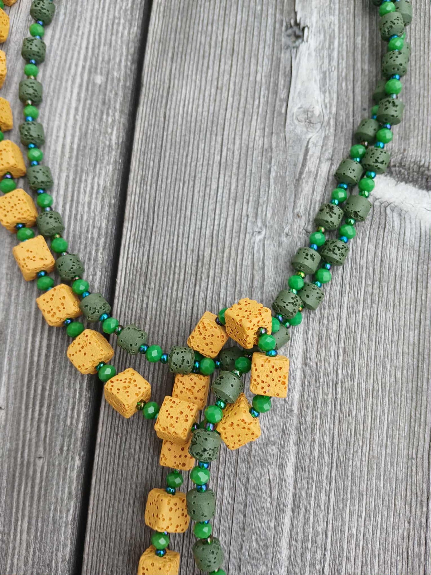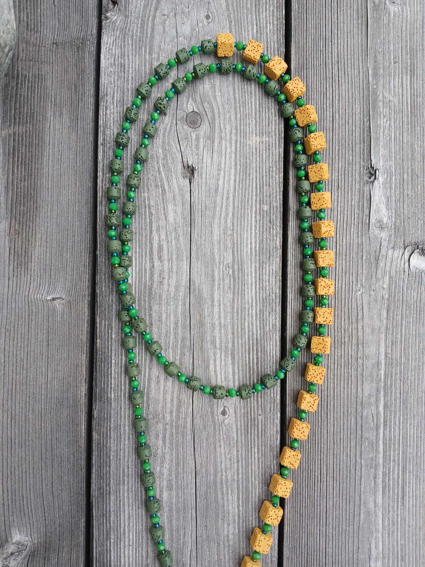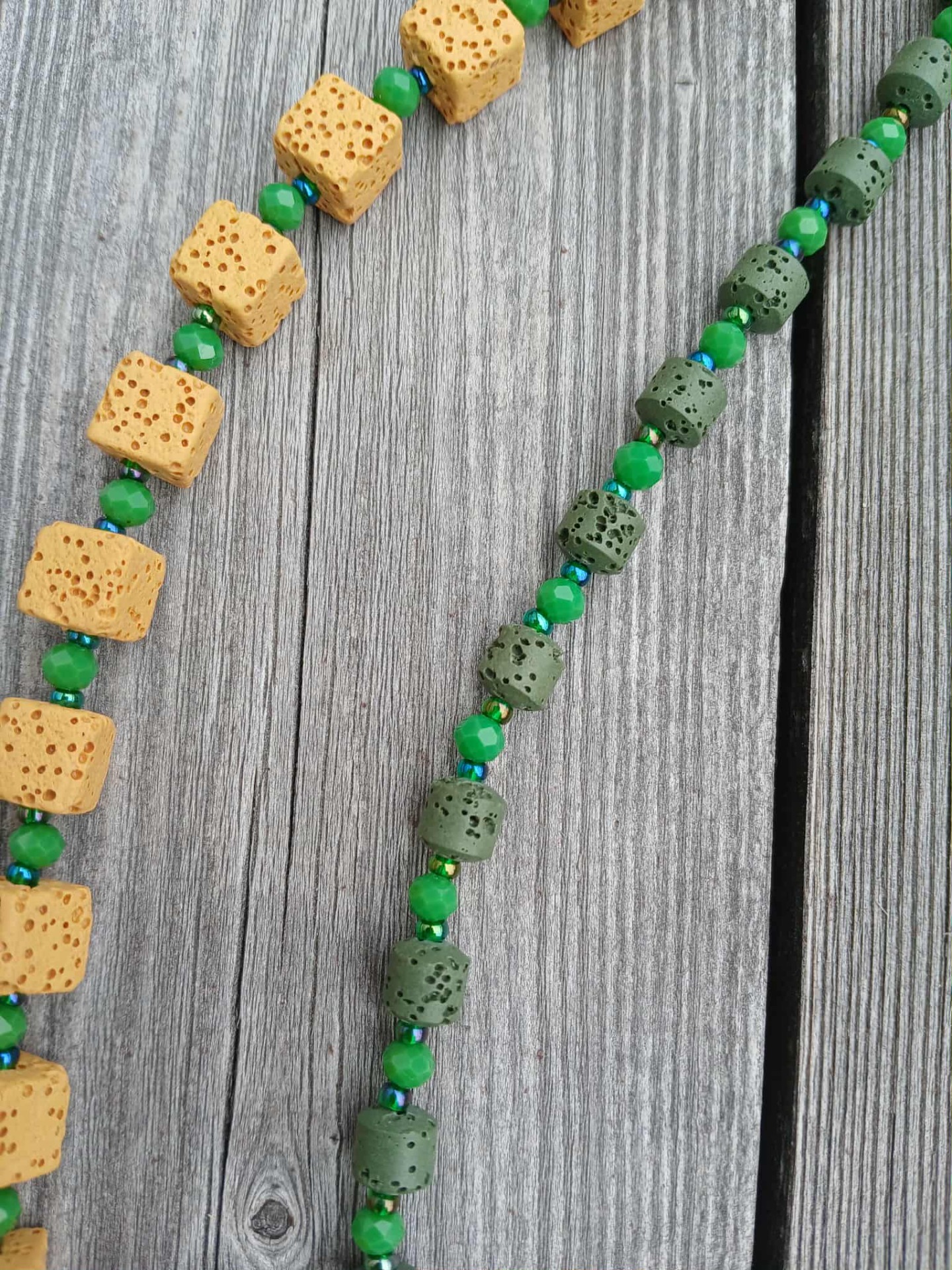 - Halsband "September nr2" består av Lavastenar i olika former, samt små facetterade glasstenar och små, små Seed Beads av glas.