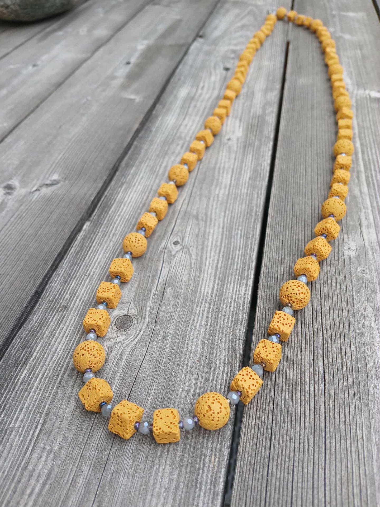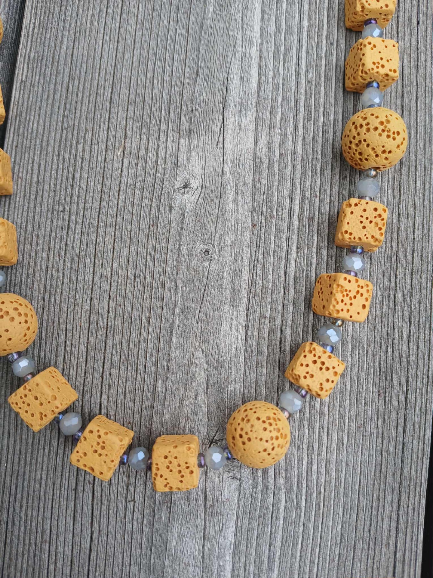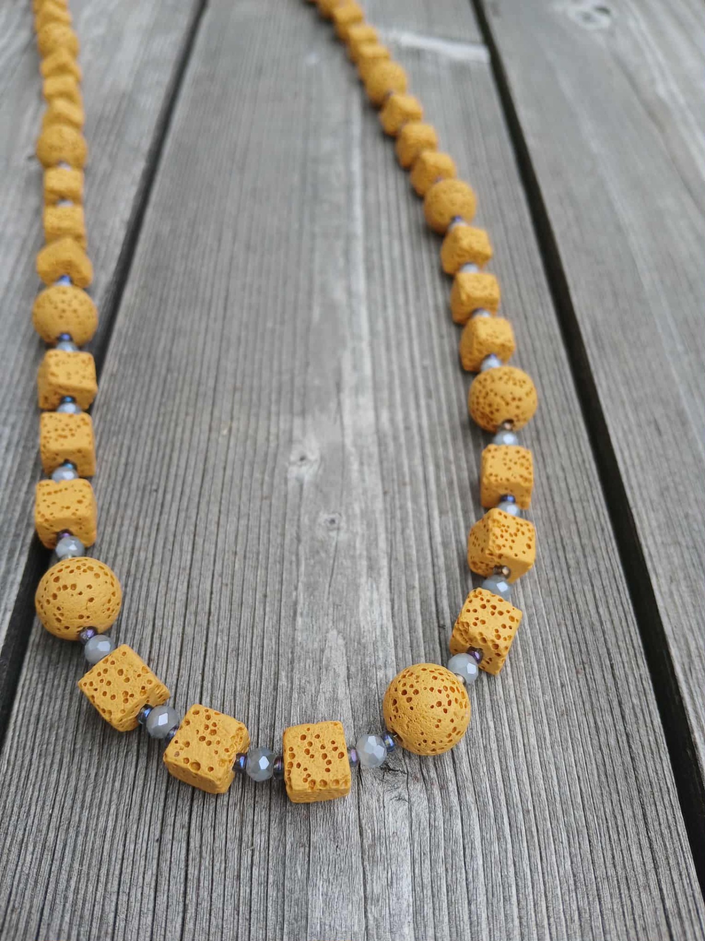 -Halsband "September" består av runda och kubformade Lavastenar samt små gråa facetterade glasstenar och små, små Seed Beads av Glas.