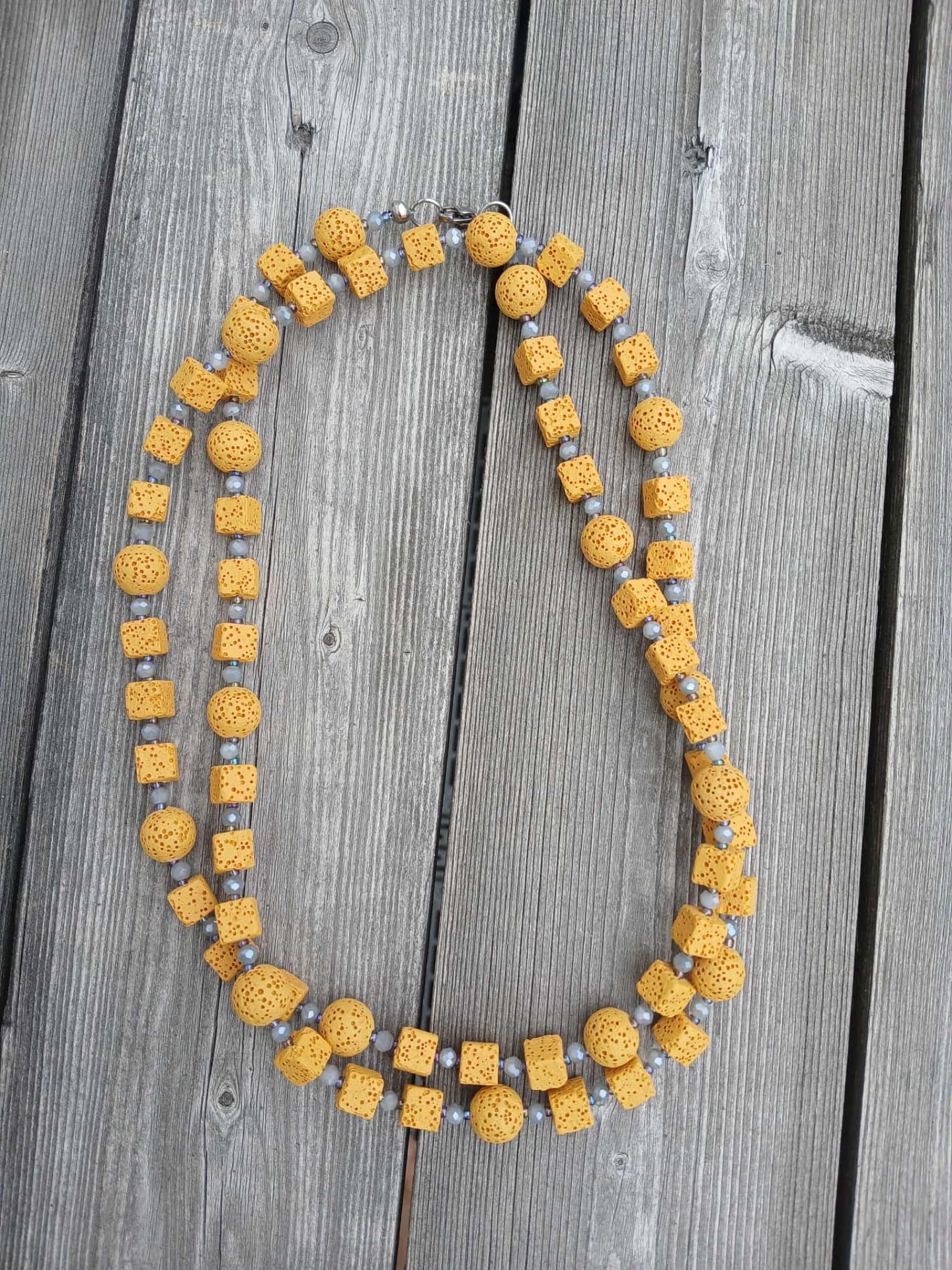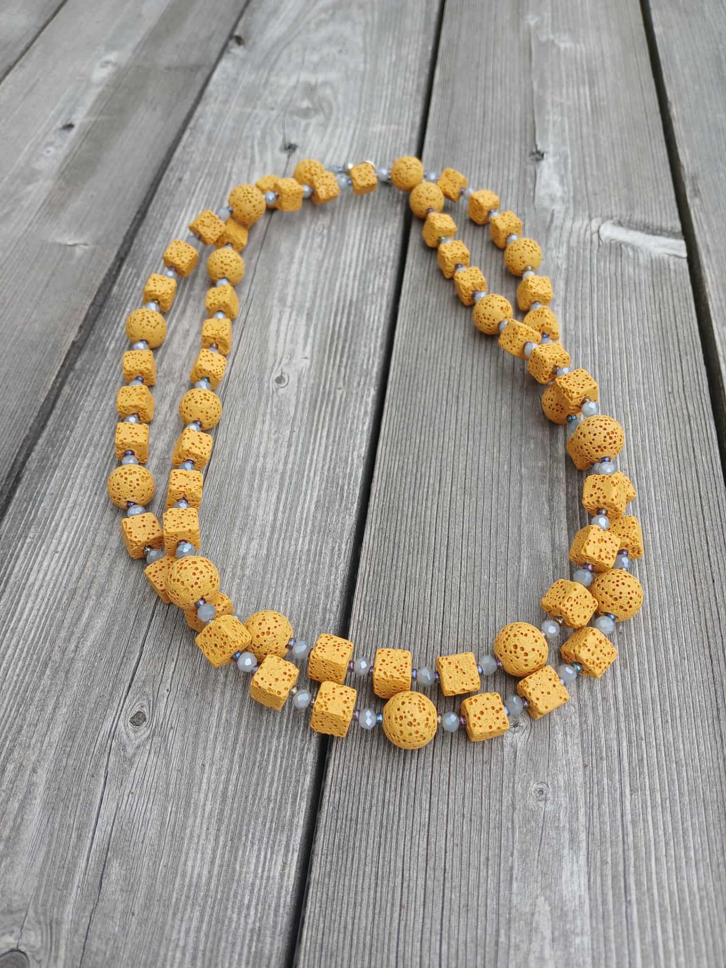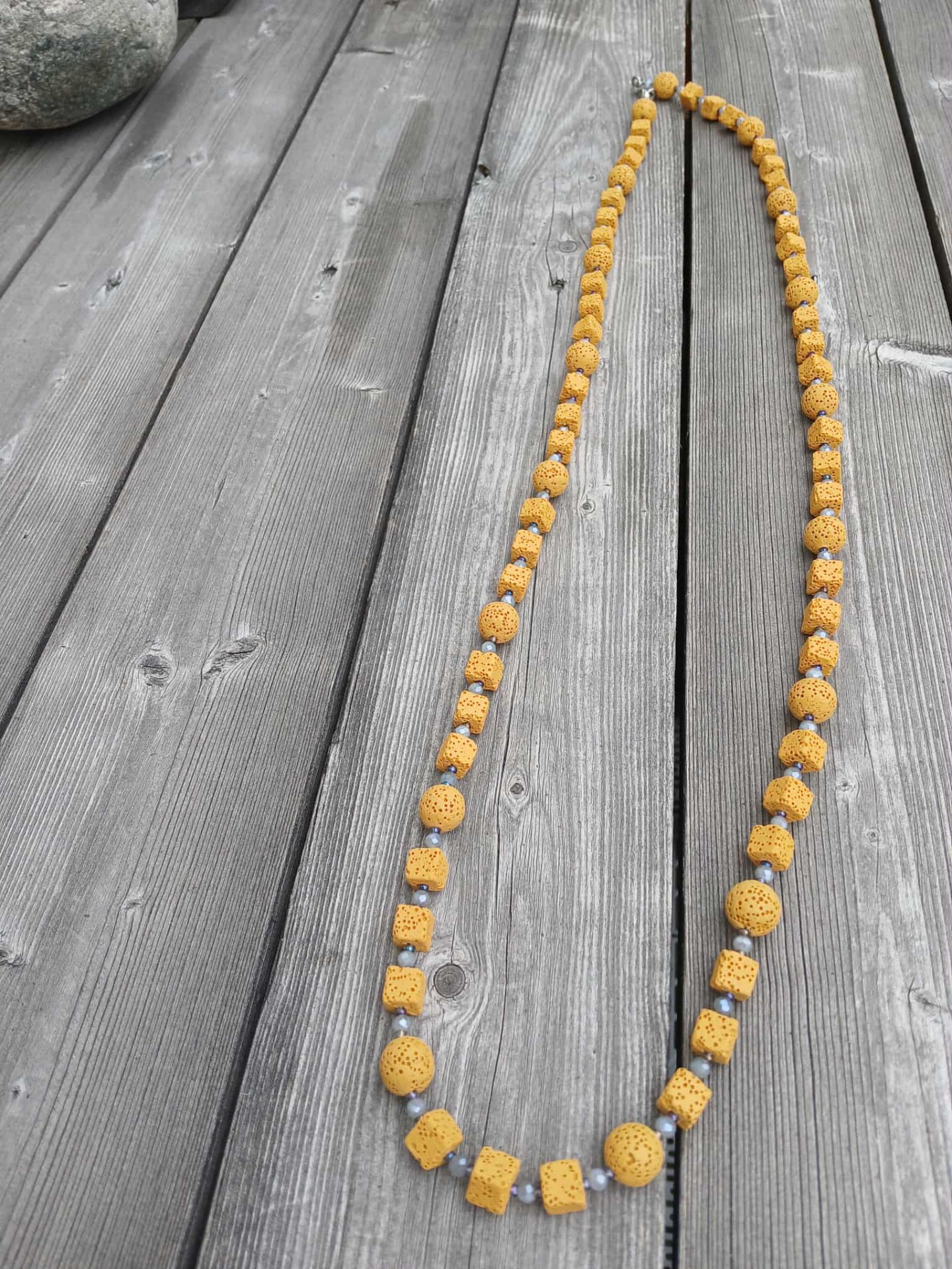 -Halsband "September" består av runda och kubformade Lavastenar samt små gråa facetterade glasstenar och små, små Seed Beads av Glas.