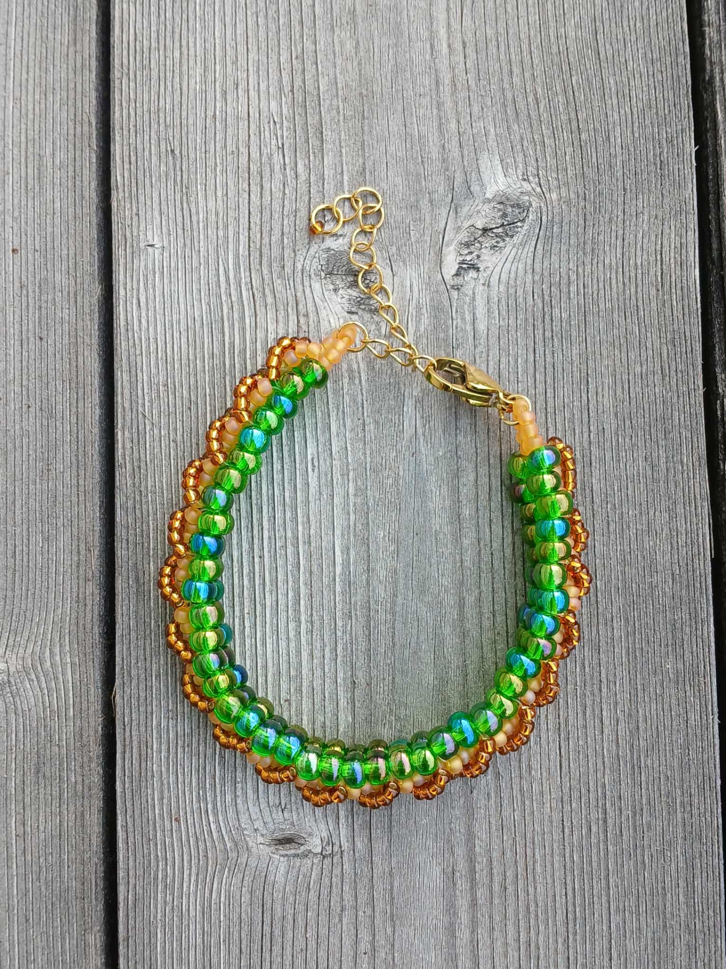 - Armband "Krispig Höst" består av Seed Beads av glas i höstens varma färger, grönt och brunt. - Armband "Krispig Höst" = ca 17cm - 22cm